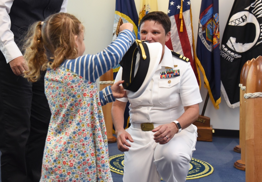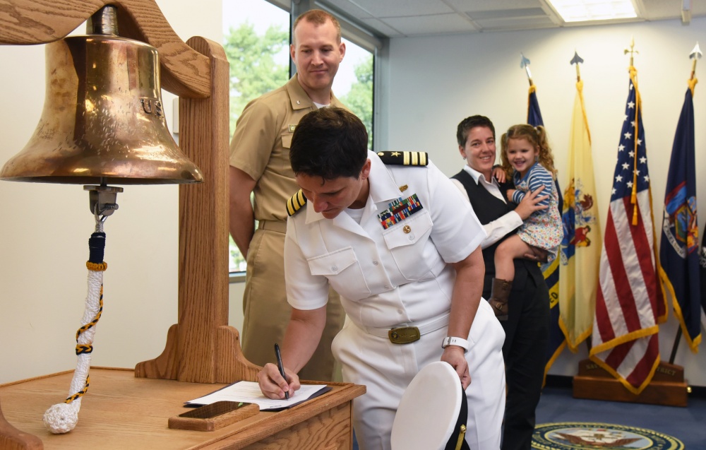 U.S. Navy officer Penny Glover is the prospective executive officer of the Navy Recruiting District New York and a graduate of Cedar Crest College, the Naval War College, and Capella University. She is a native of Uniontown, Pennsylvania and graduate of Northeast Senior High School in Pasadena, Maryland. During her promotion ceremony from lieutenant commander to commander on October 1, at Navy Recruiting District New York headquarters, her wife and daughter changed out her shoulder boards for ones with the insignia of her new rank.
