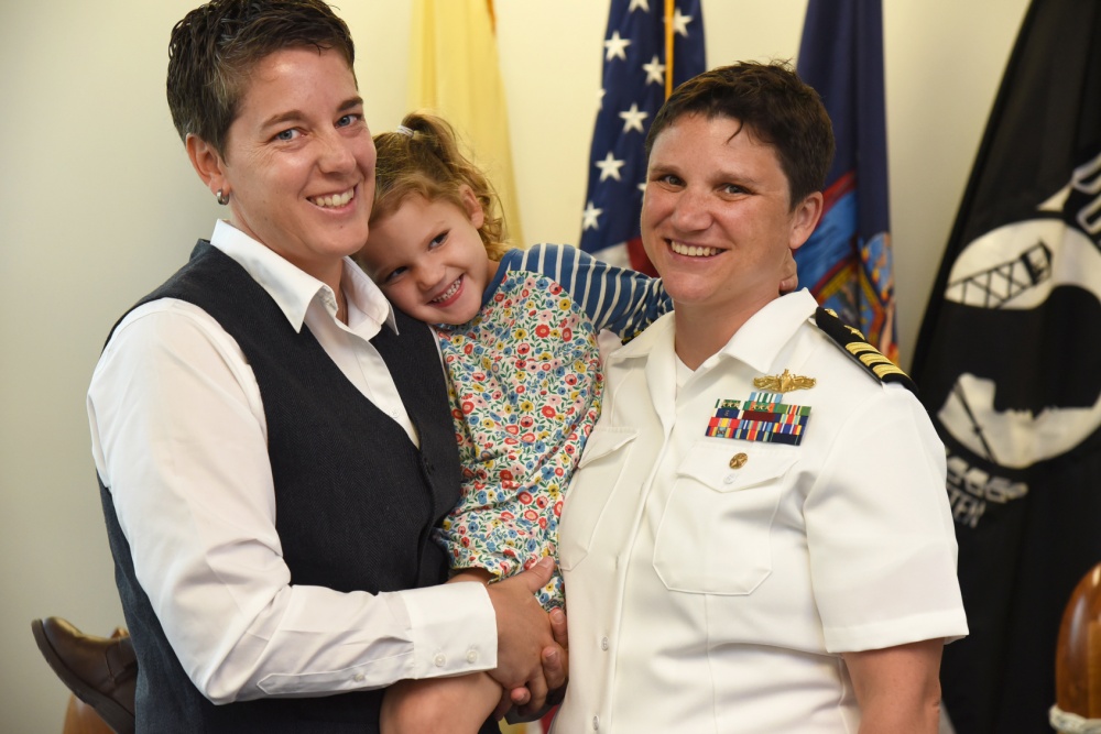 A decade ago, I wrote an article about a deeply closeted military family living under “Don’t Ask, Don’t Tell.” One of the things that saddened them was that the service member’s wife and children would not be able to participate in an upcoming promotion ceremony, which for married officers involves their spouse and children. Yesterday, the Navy Office of Community Outreach contacted me to send me the photos of Glover and her family. Times have changed for the better, my friends.
